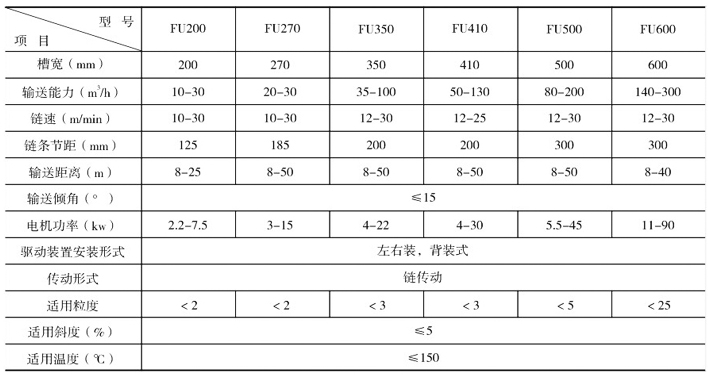 ·FU系列刮板輸送機(jī)廣泛運(yùn)用于堆積密度<l.6t/m3,磨琢性較強(qiáng),粉、粒、小塊狀物料的水平、小傾角(≤50)連續(xù)輸送,如煤粉、碎煤、水泥、粉煤灰、焦粉、焦粒、礦粉、化肥、糧食等大輸送量(≤600t/h)、長(zhǎng)距離(<60m)、較高溫度(<150℃)物料的連續(xù)輸送。