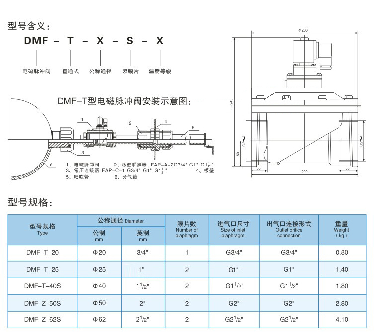 DMF-T型電磁脈沖閥為直通閥,其進氣口之間夾角為180°,(進出口中心線為同一直線),其進口與儲氣筒連接,出口與噴吹管連接。氣流暢通,能提供符合要求的清灰氣脈沖。
