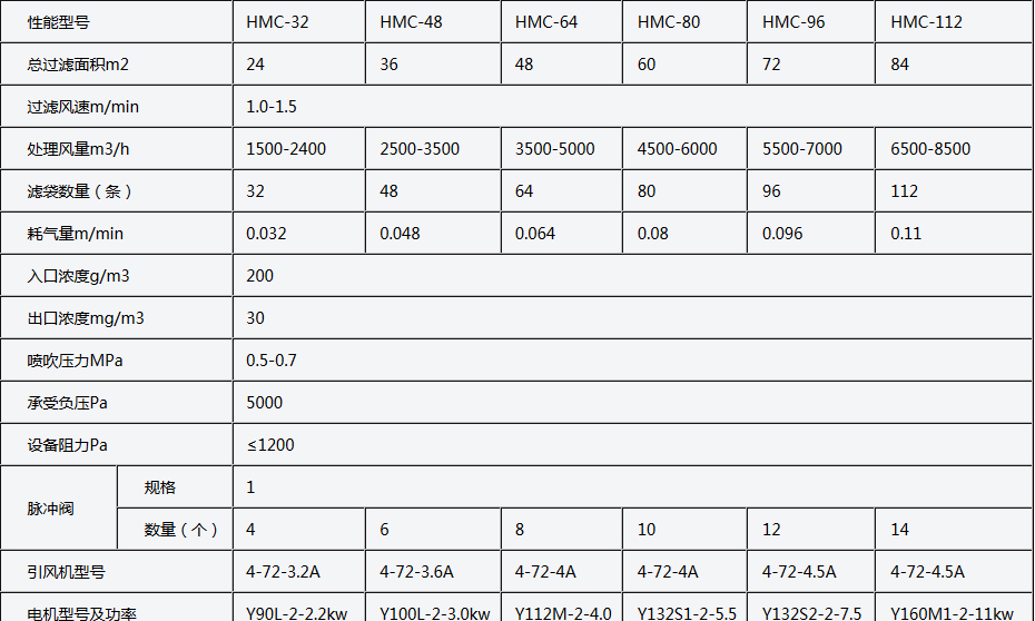 HMC單機除塵器為用戶提供了二大系列十二個規格的選型方案,每種規格可分為標準帶灰斗式A型和敞開法蘭式B型(無灰斗,適用于倉頂)二種。HMC系列單機型號區別在于濾袋數,12為一組。我公司可提供24袋、32袋、48袋、64袋、72袋、80袋、96袋、112袋、120袋等各規格HMC系列設備(部分性能參數可參照下表)。我們將根據您的實際環境參數,提供最佳解決方案。